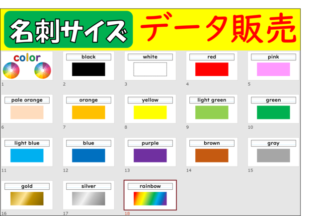 カードサイズの色の名前カードのデータです。 メジャーな17色の英語がいつでも確認できるようになっています。 家庭学習や個別指導にオススメです。 単元は小3の外国語活動 「色」 ◆内容 表紙・黒・白・赤・ピンク・オレンジ・薄だいだい・黄・黄緑・緑・水色・青・紫・茶色・灰色・金・銀・虹 表は言葉と図 裏は図だけ 計17色・34スライド分(+表紙) カードサイズですので机の上で子どもと一緒に確認ができます。 日常使いの多い色を中心に選んでいます。 ◯カードのデータ (PDF) ◯印刷時の注意点説明 を用意しています。 めくりやすく使いやすいこちらの用紙が印刷にオススメです。 https://amzn.to/3q6XPv0