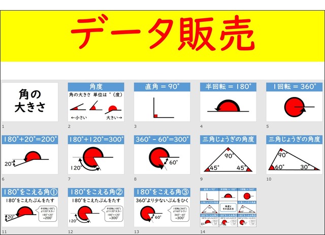 【データのみの販売】 授業で使えるフラッシュカードです。 単元は小4算数の「角とその大きさ」です。 子どもに覚えてもらいたい基礎の勉強と、間違えやすい角の求め方をカードにしています。 内容は タイトル、角度の定義、直角、半回転、一回転、180°を超える角度の求め方6枚(180°に加える×2、360°から引く、それらの解説付き×3)、三角定規の角度×2、用語や求め方まとめ 計27スライドです。 表は言葉と図 裏は図だけor問題が書かれています。 表を読ませた後に裏返して復習 という使い方ができるようにしています。 教科書の内容に沿っており、知識・理解の定着を促すことができます。授業の最初に使うこともあれば、授業中に黒板に貼ることもあります。 ◯両面分のデータ(PDF) ◯表面のみのデータ(PDF) ◯裏面のみのデータ(PDF) ◯フラッシュカード作成の基データ を用意しています。 フラッシュカード作りにおすすめの紙(A4・ハガキより厚め)はこちら。 https://amzn.to/36e0qfA