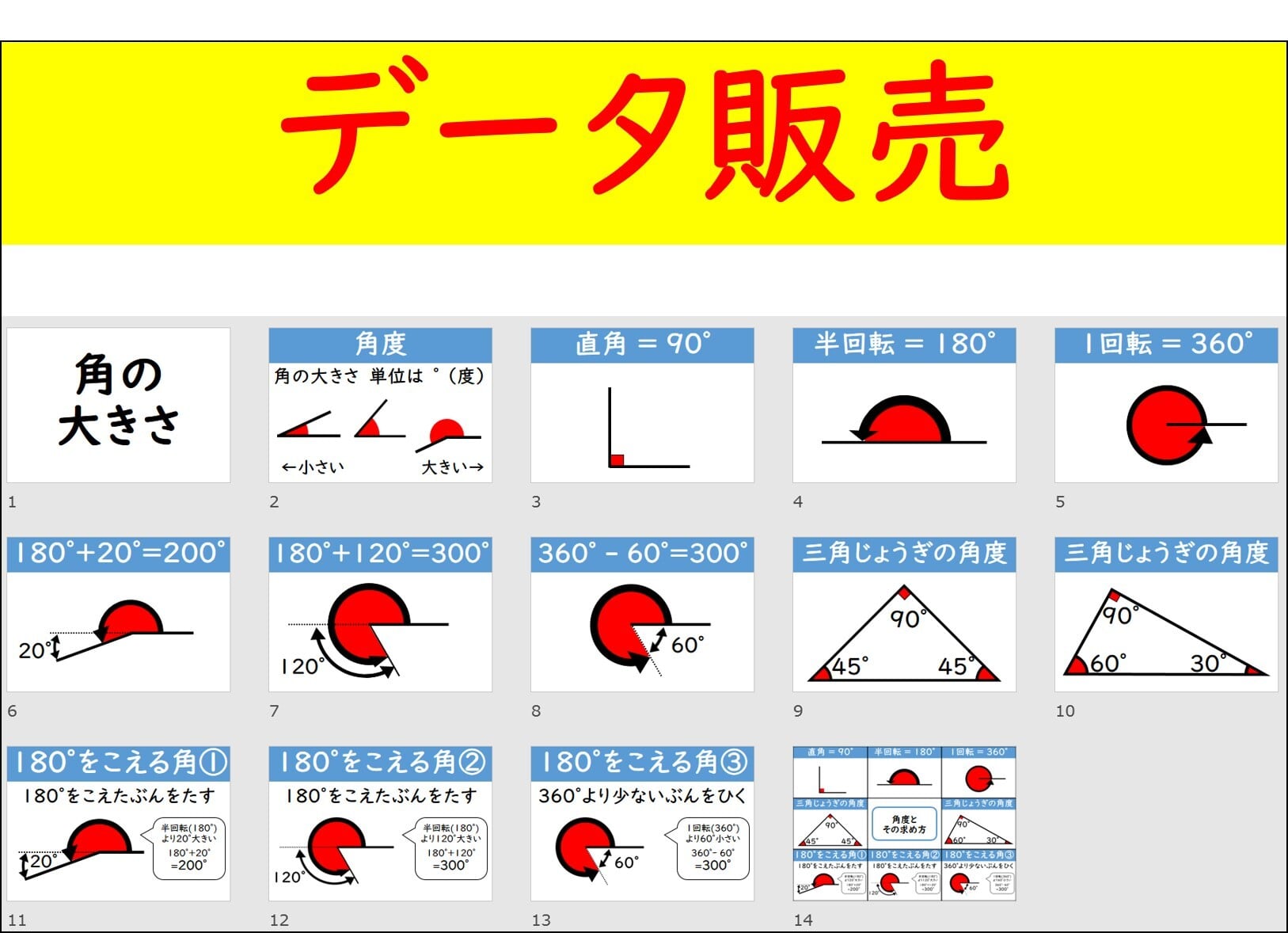 タイトル、角度の定義、直角、半回転、一回転、180°を超える角度の求め方6枚(180°に加える×2、360°から引く、それらの解説付き×3)、三角定規の角度×2、用語や求め方まとめ