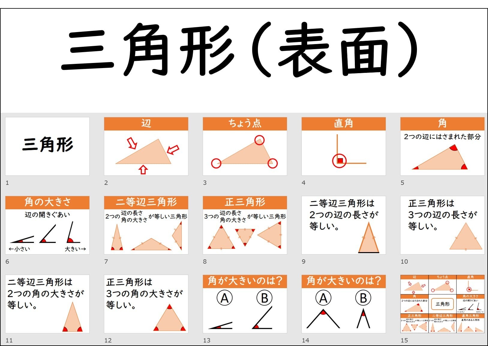タイトル、辺、頂点、角、直角、角の大きさ、二等辺三角形、正三角形、二等辺三角形の辺、正三角形の辺、二等辺三角形の角、正三角形の角、角の大きさ比較×2、まとめ