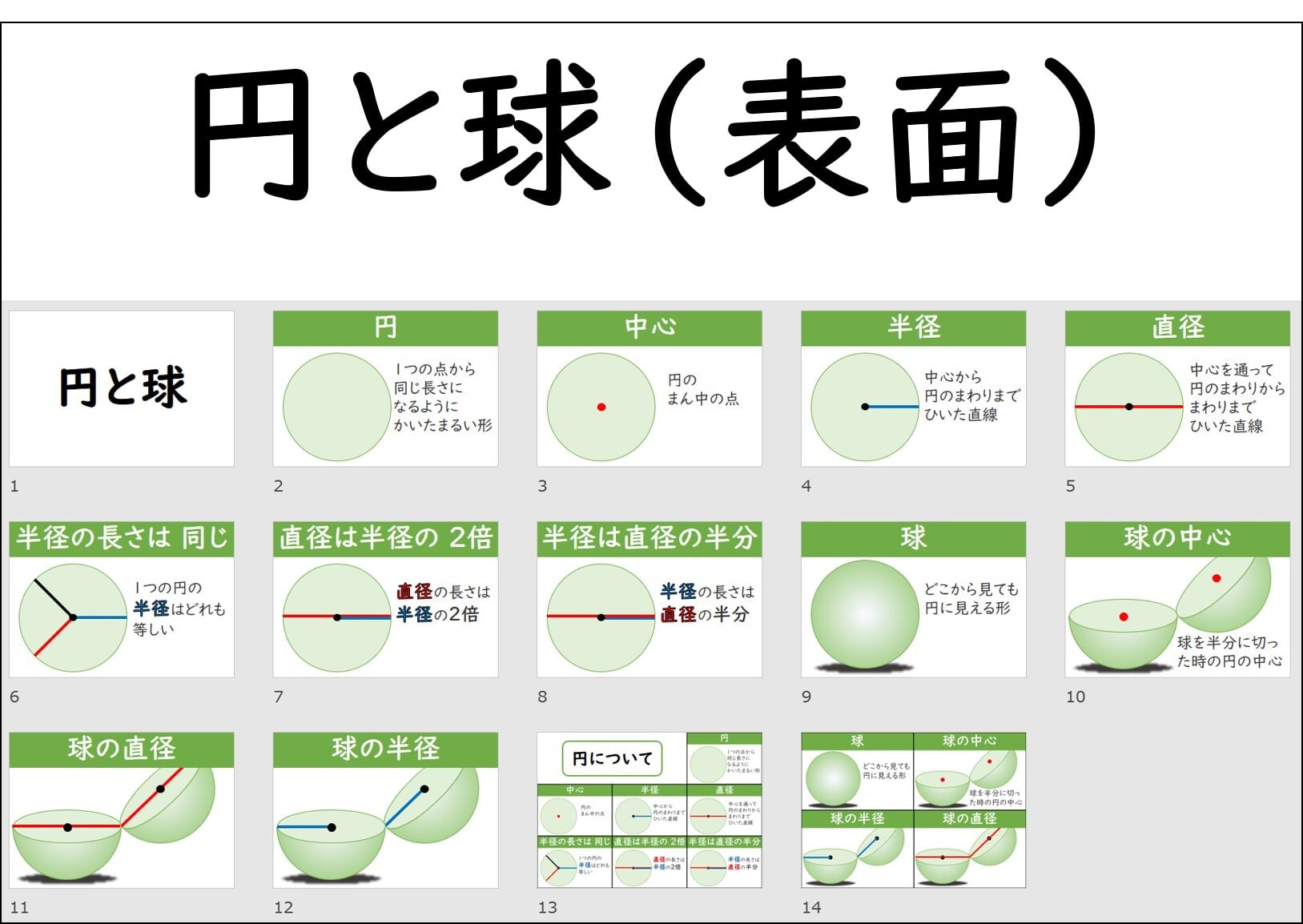 タイトル、円のまとめ、球のまとめ、円、中心、直径、半径、半径の長さ、半径と直径の関係×2、球、球の中心、球の直径、球の半径