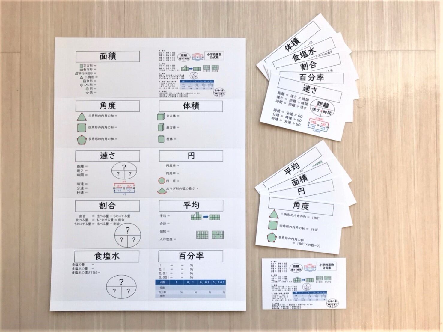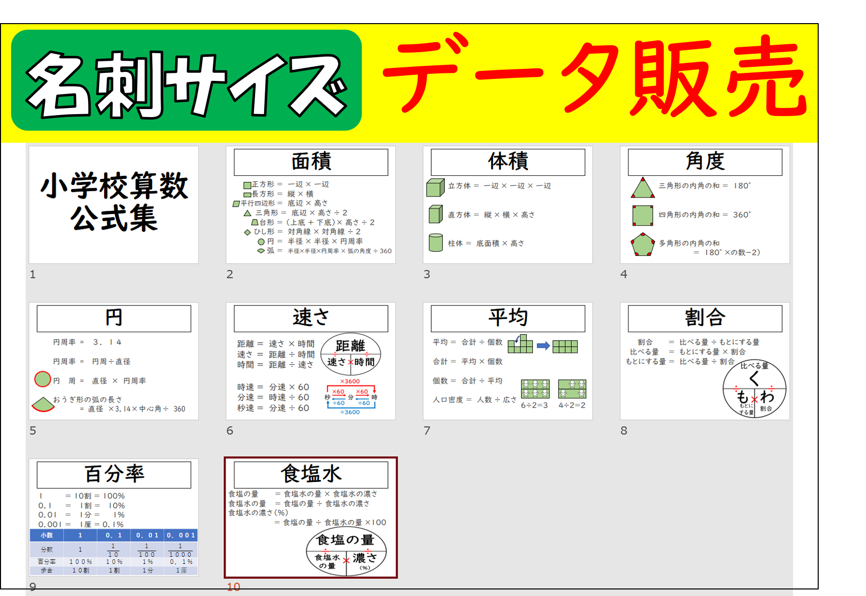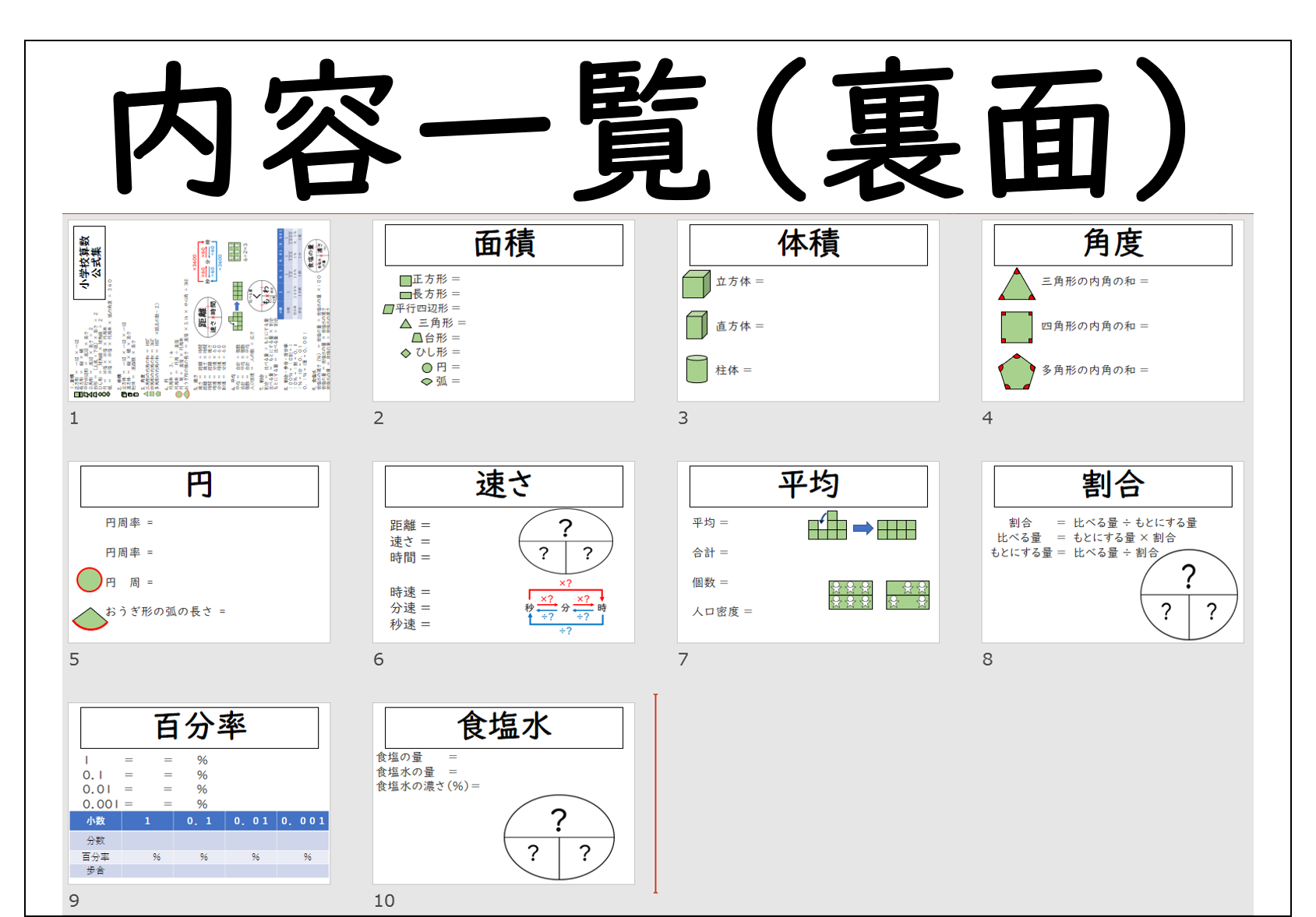 全公式一覧(両面)・面積・体積・角度・円・速さ・平均・割合・百分率・食塩水・A4サイズの公式一覧シート