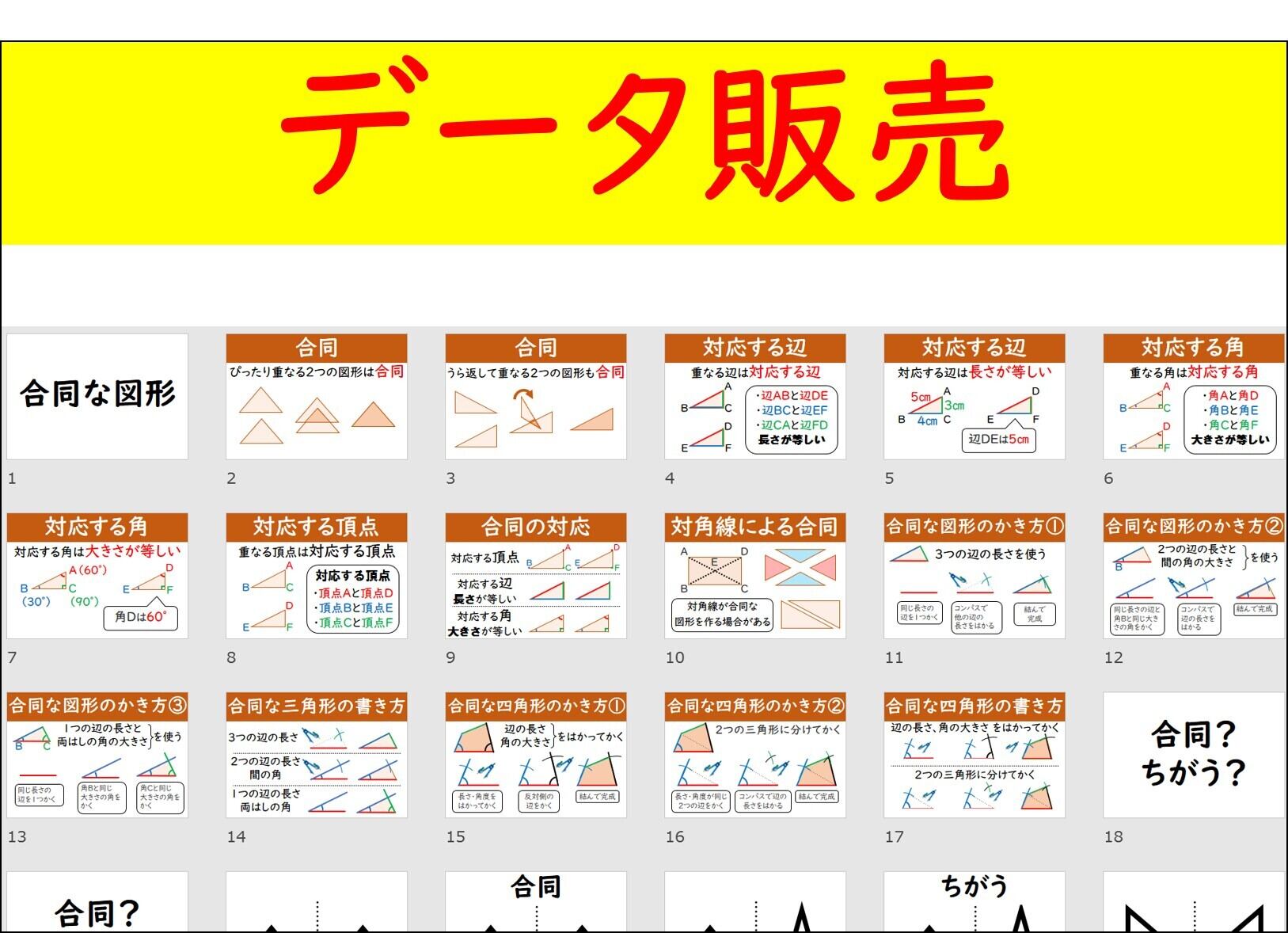 タイトル、合同の定義、対応する辺、対応する角、対応する頂点、対応のまとめ、対角線が作る合同、合同な図形の書き方×3、合同な図形のかき方、合同な四角形のかき方×2、合同な四角形のかき方まとめ、合同かどうかの判断×9、単元のまとめ