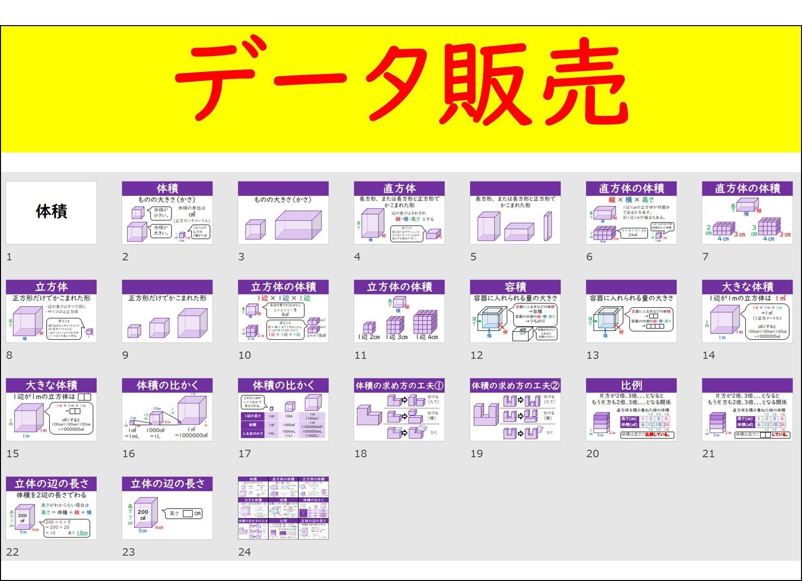 タイトル、体積の定義、直方体、直方体の体積、立方体、立方体の体積、容積、大きな体積、体積の比較、工夫した体積の求め方×2、比例、立体の辺の長さの求め方、単元のまとめ