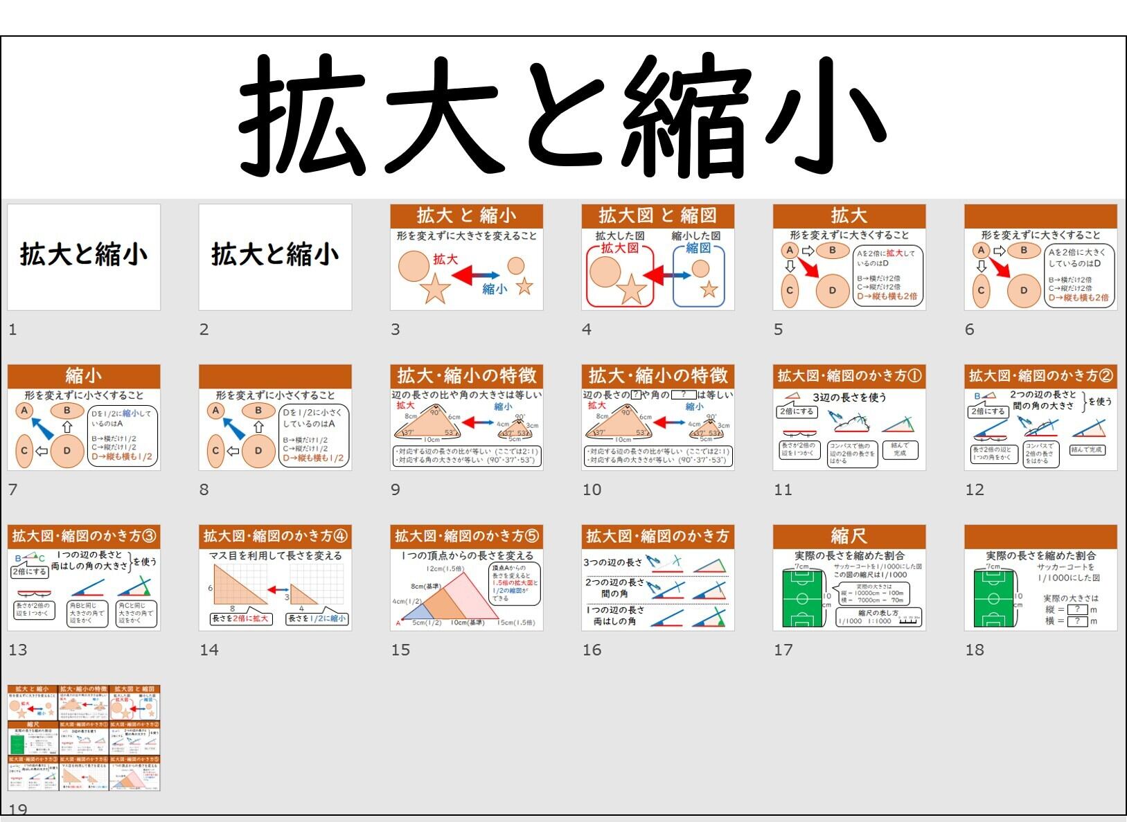タイトル、拡大、縮小、拡大・縮小の特徴、拡大図と縮図、拡大図・縮図のかき方×5、縮尺、単元のまとめ