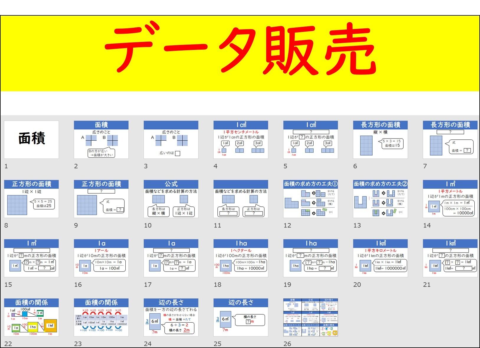 タイトル、面積の定義、1㎠、長方形の面積、正方形の面積、公式の定義、工夫した面積の求め方×2、1㎡、1a、1ha、1㎢、面積の関係、辺の長さの求め方、単元のまとめ