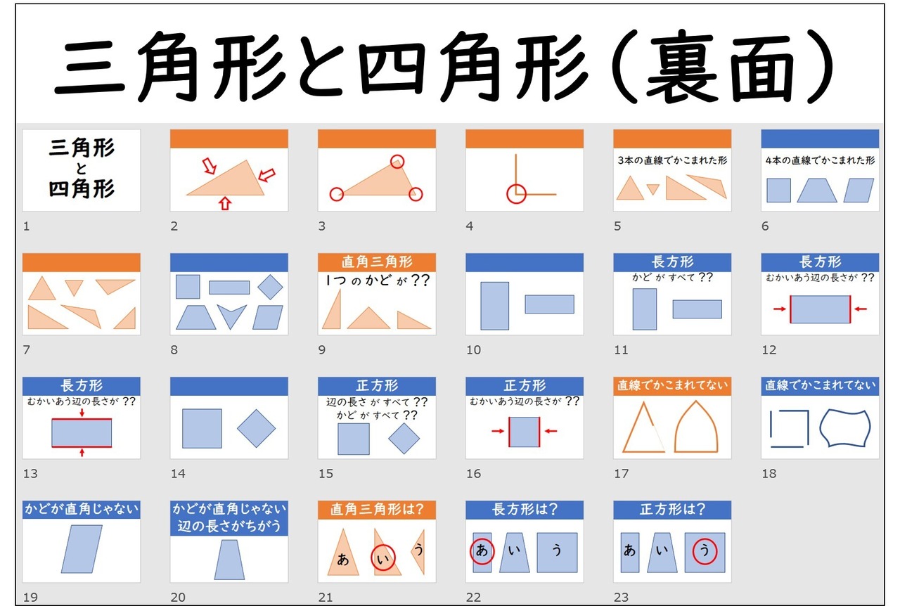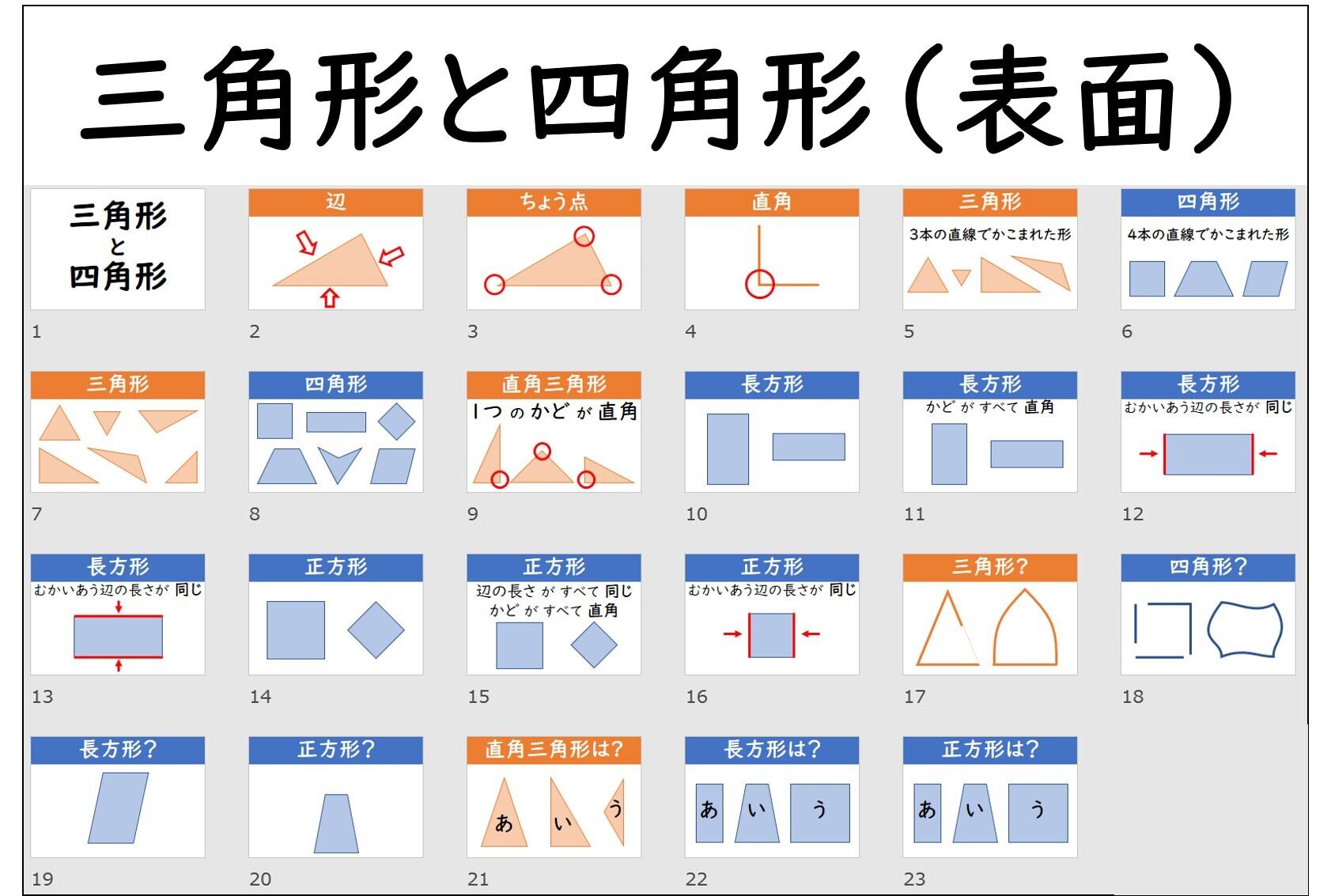 タイトル、辺、ちょう点、直角、三角形の定義、四角形の定義、様々な三角形、様々な四角形、直角三角形の定義、長方形、長方形の定義、長方形の向かい合う辺×2、正方形、正方形の定義、正方形の向かい合う辺、ダミー三角形、ダミー四角形、長方形の判別、正方形の判別、直角三角形はどれか、長方形はどれか、正方形はどれか