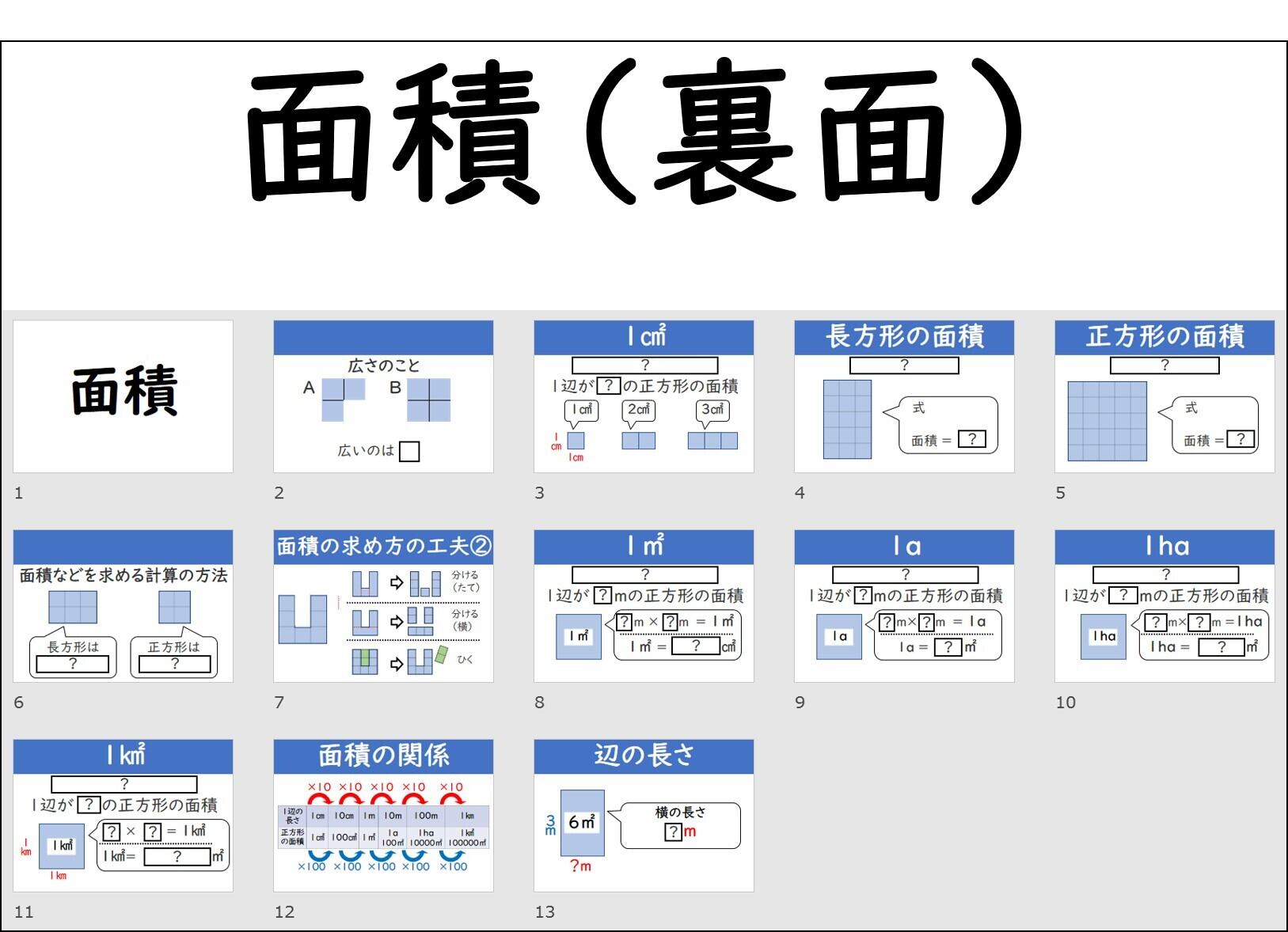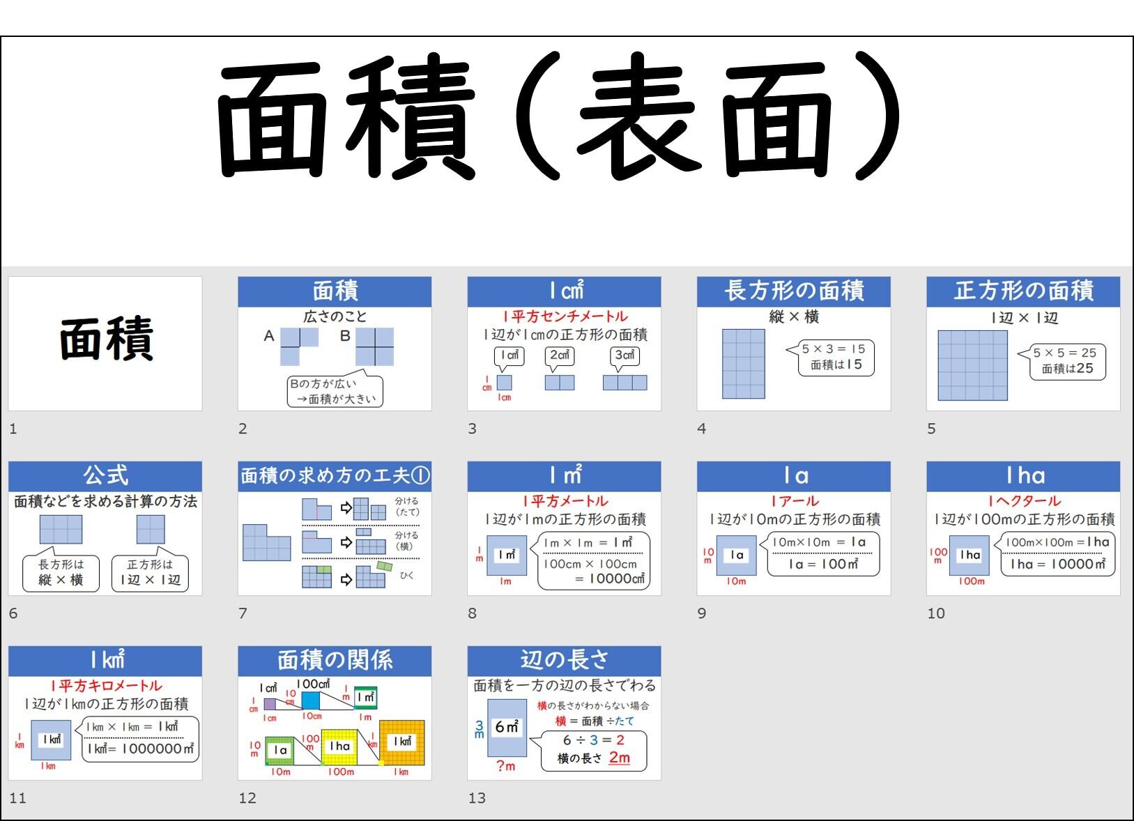 タイトル、面積の定義、1㎠、長方形の面積、正方形の面積、公式の定義、工夫した面積の求め方×2、1㎡、1a、1ha、1㎢、面積の関係、辺の長さの求め方