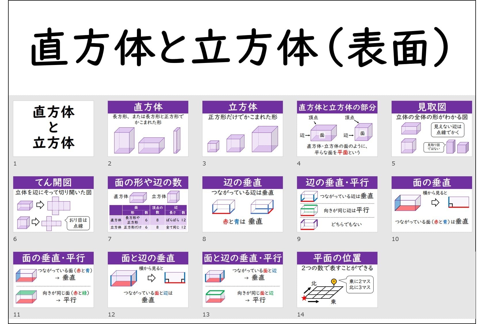 タイトル、直方体、立方体、立体の部位、見取図、展開図、辺や面の数、辺の関係×2、面の関係×2、辺と面の関係×2、平面・空間の位置