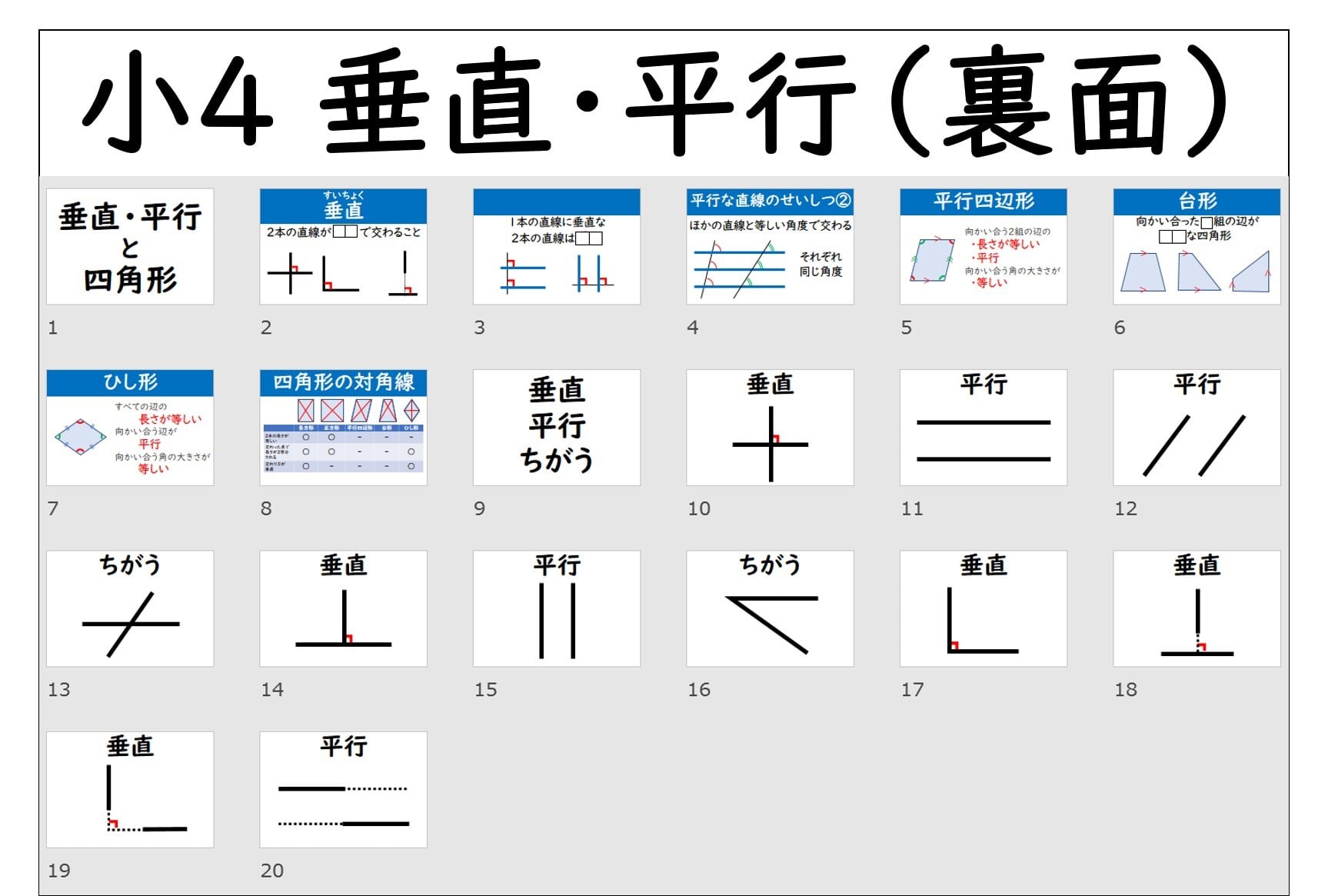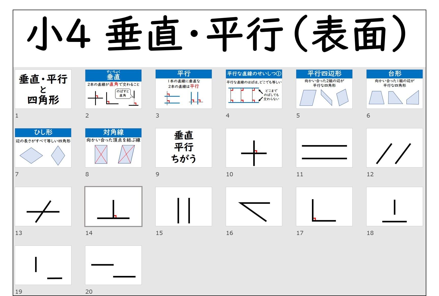 タイトル、垂直、平行、平行の性質×2、平行四辺形、台形。ひし形、対角線、垂直・平行の練習×11